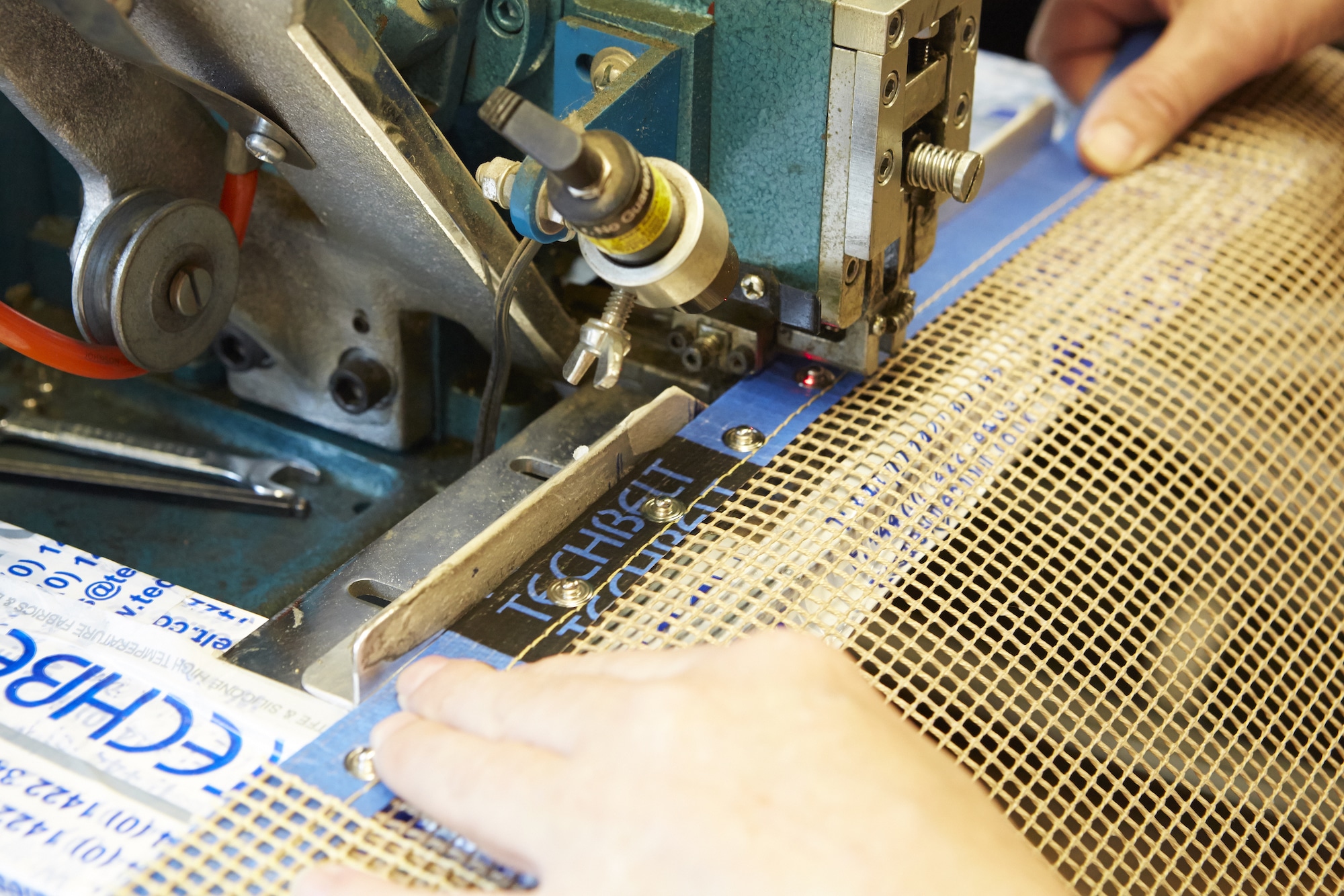 Need an extra wide conveyor belt? at Techbelt we can manufacture wide PTFE mesh dryer belts up to 5200mm wide. Above is a picture of one of a pair of belts being made for one of our customers.